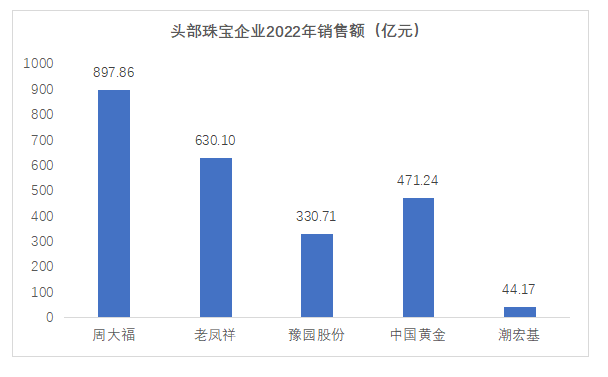截止到目前,珠寶行業(yè)主要上市2022年年報顯示,頭部企業(yè)周大福、老鳳祥、豫園股份、中國黃金門店數(shù)量分別達(dá)到5902家、5609家、4565家、3642家和1158家,銷售額分別為897.86億元、630.10億元、330.71億元、471.24億元和44,71億元。從門店數(shù)量和銷售額對比來看,門店數(shù)量越多,銷售額越多。