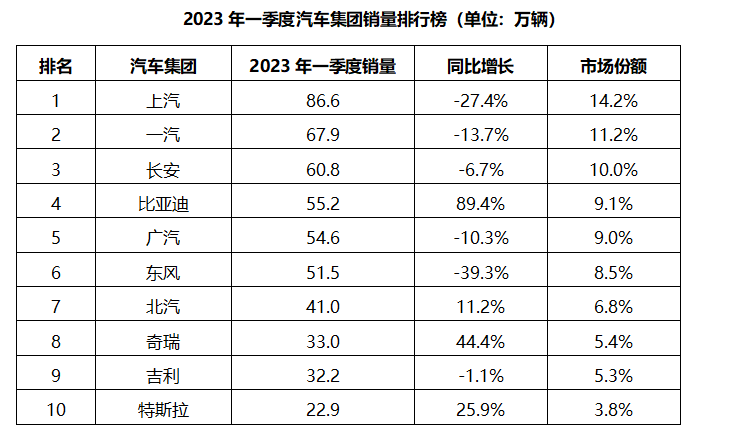 2023年1-3月,據汽車工業(yè)協(xié)會數據,汽車銷量排名前十位的企業(yè)(集團)共銷售505.7萬輛,同比下降7.8%,占汽車銷售總量的83.2%,低于上年同期1個百分點。