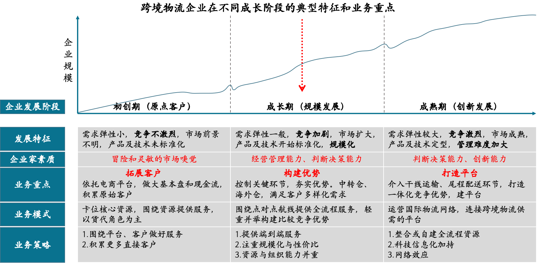 跨境物流企業(yè)在不同的成長階段,具有迥異的發(fā)展特征,業(yè)務(wù)重點(diǎn)也大不相同。需要正視企業(yè)的發(fā)展階段,有的放矢,要從客戶驅(qū)動到能力驅(qū)動,到最終平臺驅(qū)動,逐級夯實(shí)。