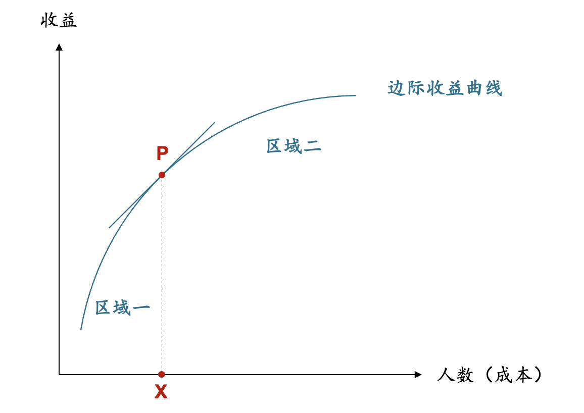 人效提升絕不等同于降薪裁員,因為企業(yè)總收入、總人數(shù)、平均薪酬是一個相互作用的整體,共同對企業(yè)的人均效能產生影響。例如,在經濟學中有一個邊際收益的概念,認為企業(yè)存在一個理論上的總人數(shù)最佳值(下圖X點),當企業(yè)實際人數(shù)等于該最佳值時,企業(yè)邊際收益最高(下圖P點,位于此點的切線斜率為1),此時企業(yè)人均效益也最高;當實際人數(shù)大于該最佳值時,隨著企業(yè)人數(shù)的增加,企業(yè)成本增加的幅度大于收益增加的幅度,邊際收益遞減(區(qū)域二,切線斜率小于1),企業(yè)的人均效益下降;當企業(yè)實際人數(shù)小于該最佳值時,隨著企業(yè)人數(shù)的增加,邊際收益遞增(區(qū)域一,切線斜率大于1),人均效益也會提升。此外,薪酬水平的高低也會對企業(yè)總人數(shù)、總收入產生影響,最終影響企業(yè)的人效水平:薪酬水平過高,企業(yè)薪酬總成本就高,企業(yè)人效水平就會相對降低;薪酬水平過低,企業(yè)人才流失,總收入就會減少,人均效能也有可能降低。