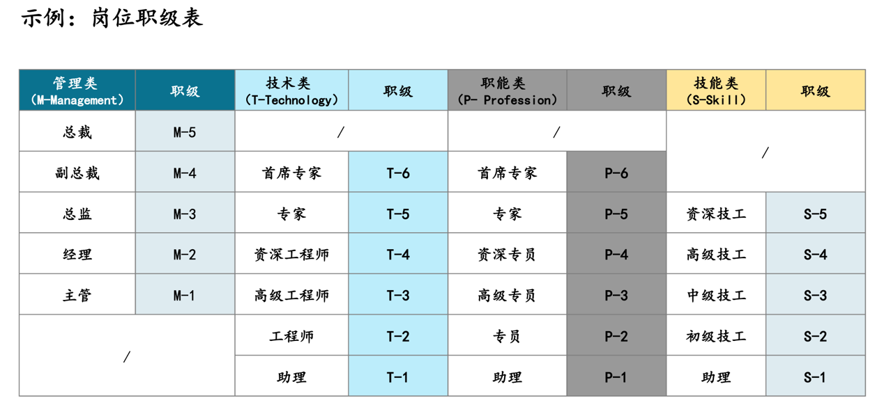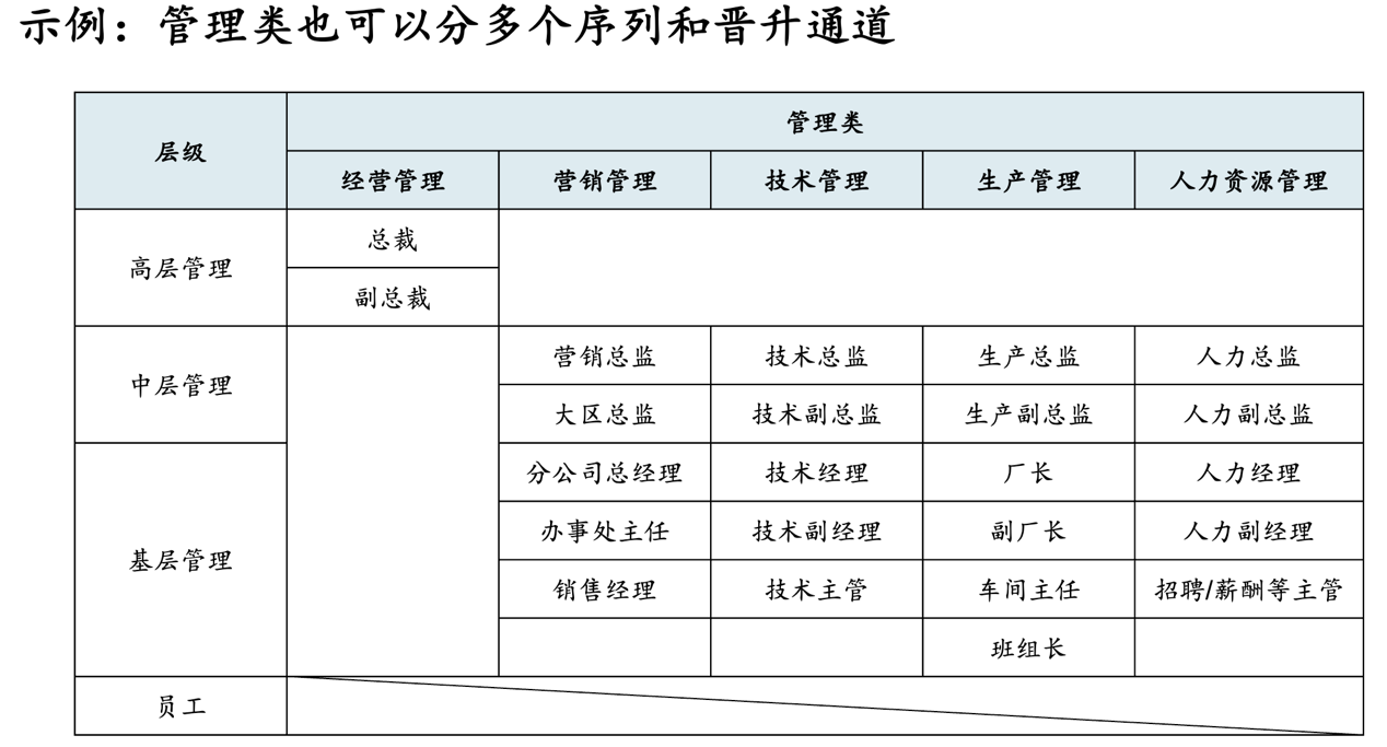 職級(jí)線基于組織崗位職級(jí)體系,可以理解為組織中的員工晉升通道。崗位職級(jí)體系的搭建首先要對(duì)崗位進(jìn)行橫向分類,其次要對(duì)各類別的崗位進(jìn)行縱向分級(jí)。
