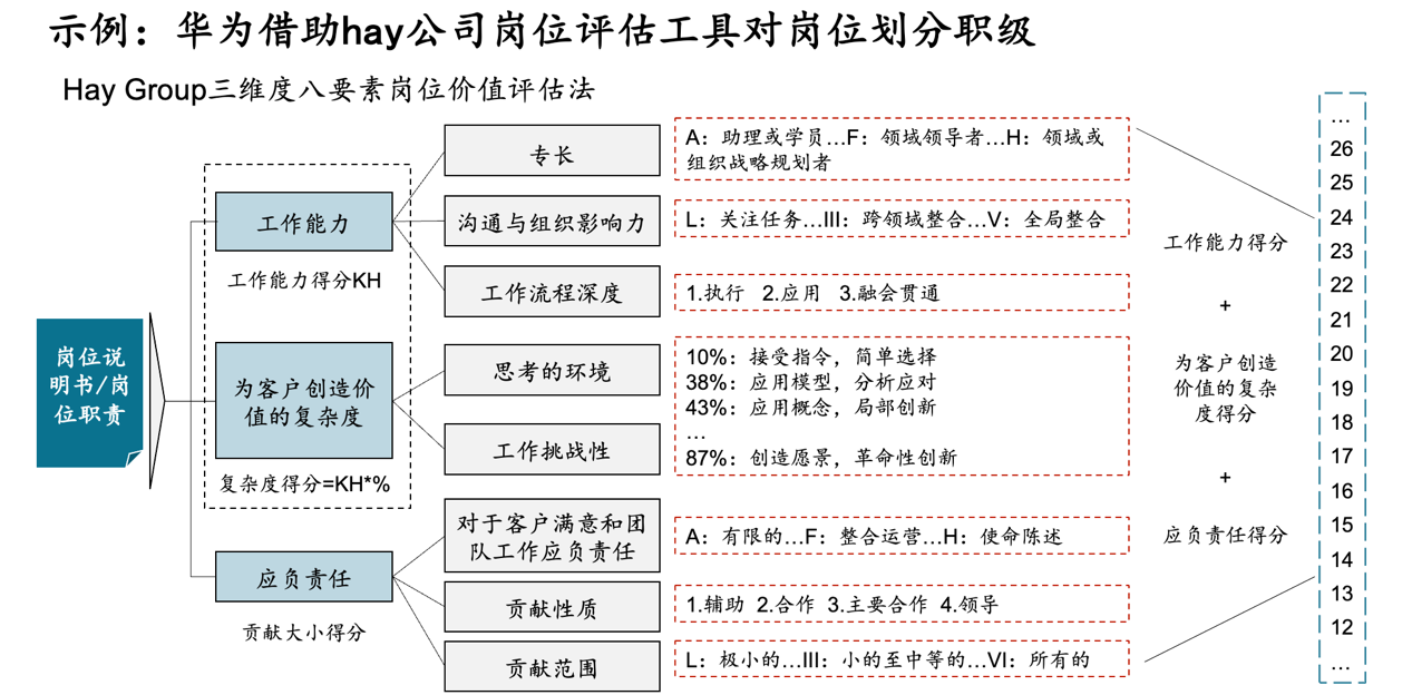 組織中職級(jí)的劃分可以采用自上而下或自下而上兩種方法。自上而下法即借助崗位價(jià)值評(píng)估工具進(jìn)行,如美式IPE崗位價(jià)值評(píng)估工具、HAY公司三維度八要素價(jià)值評(píng)估法等,先評(píng)估出整個(gè)組織的崗位職級(jí)體系,再根據(jù)組織崗位類別劃分情況,將所有崗位按照橫向類別和縱向職級(jí)進(jìn)行攤派,最終形成組織的分類分級(jí)的崗位職級(jí)表。自下而上的職級(jí)劃分方向與自上而下的方法流程相反,但是工作內(nèi)容沒有什么差別。這種方法是先在各個(gè)崗位類別(通常為職種/序列)中根據(jù)崗位工作責(zé)任、任職要求以及行業(yè)普遍叫法對(duì)崗位進(jìn)行自下而上的職級(jí)劃分,例如人力資源序列自下而上可以劃分為專員-主管-高級(jí)主管-經(jīng)理-高級(jí)經(jīng)理-總監(jiān)-總經(jīng)理等;研發(fā)序列自下而上可以劃分為助力工程師-工程師-中級(jí)工程師-高級(jí)工程師-資深工程師-首席工程師;銷售序列可以劃分為銷售助理-銷售專員-銷售經(jīng)理-區(qū)域經(jīng)理-大區(qū)經(jīng)理-區(qū)域總監(jiān)-銷售總監(jiān)-銷售總經(jīng)理等。當(dāng)各序列內(nèi)部的職級(jí)基本確定之后,再采用崗位價(jià)值評(píng)估工具橫向評(píng)估各個(gè)序列之間崗位的崗位相對(duì)價(jià)值,再結(jié)合評(píng)估結(jié)果,將整個(gè)組織的崗位進(jìn)行分類分級(jí)攤派,最終形成能體現(xiàn)同一序列內(nèi)部以及不同序列之間的崗位職級(jí)體系圖譜。