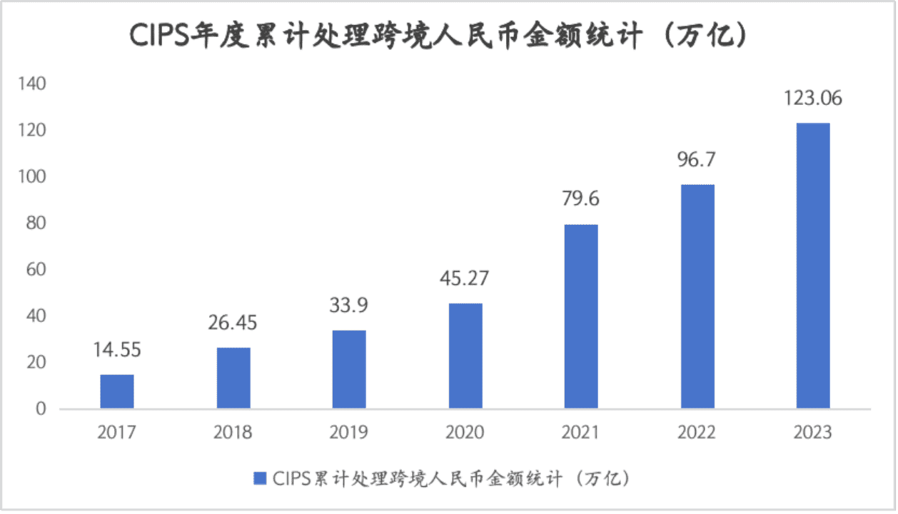 隨后, 2016 年人民幣在美元、歐元、日元和英鎊之后,被納入國際貨幣基金組織的 “特別提款權 ”(SDR)貨幣籃子。由于特別提款權是外匯資產(chǎn)的補充,被納入特別提款權意味著人民幣在全球金融體系中的認可度不斷提高。此外,另一個重要里程碑是人民幣跨境支付系統(tǒng)(CIPS)的建立,與環(huán)球銀行間金融電信協(xié)會(SWIFT)相比,CIPS 提供清算和結算服務,重點促進以人民幣計價的交易。下圖顯示,從 2020年到 2024 年的五年間,CIPS 處理的跨境支付增加了 近130萬億元,這標志著人民幣在國際結算中的利用率正在迅速上升。