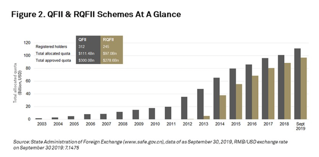 人民幣合格境外機構投資者(RQFII)計劃成立于 2011 年,允許持有 RQFII 額度的外國投資者以人民幣直接投資 A 股市場。與其前身 QFII 一樣,RQFII 進一步開放了中國的資本市場,以吸引外資和專業(yè)人才進入國內(nèi)市場。從圖中我們可以推斷出,RQFII 投資者獲配的總額度近年來增長迅速。2020 年,中國取消了 QFII 和 RQFII 的額度限制,進一步降低了外國投資者投資A股市場的資格門檻,加快了人民幣國際化的步伐。
