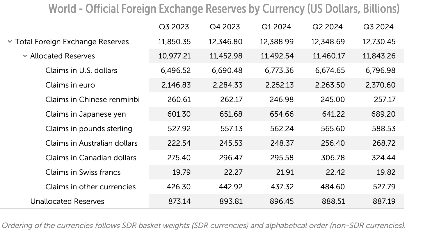 近年來,雖然美元在各種金融市場和金融工具中的主導地位逐漸下降,但其他貨幣的影響力也都尚未達到類似水平。由上圖可以看出,與美元 84.65% 的市場份額相比,人民幣僅占全球貿(mào)易的 5.08%。在儲備貨幣方面,截至IMF2024年第三季度的統(tǒng)計數(shù)據(jù),美元的國際外匯儲備使用量是人民幣的 26倍多。因此,雖然近年來人民幣在國際貿(mào)易中的使用越來越頻繁,但與美元仍有一定差距。中國要想讓人民幣超越美元,成為世界上最主要的國際貨幣,還有很多障礙需要克服。