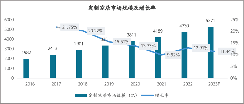 根據(jù)中商情報(bào)網(wǎng)的數(shù)據(jù),定制家居行業(yè)的市場規(guī)模逐年增加,但增長率在逐年下降。2023年市場規(guī)模達(dá)到5271億元。