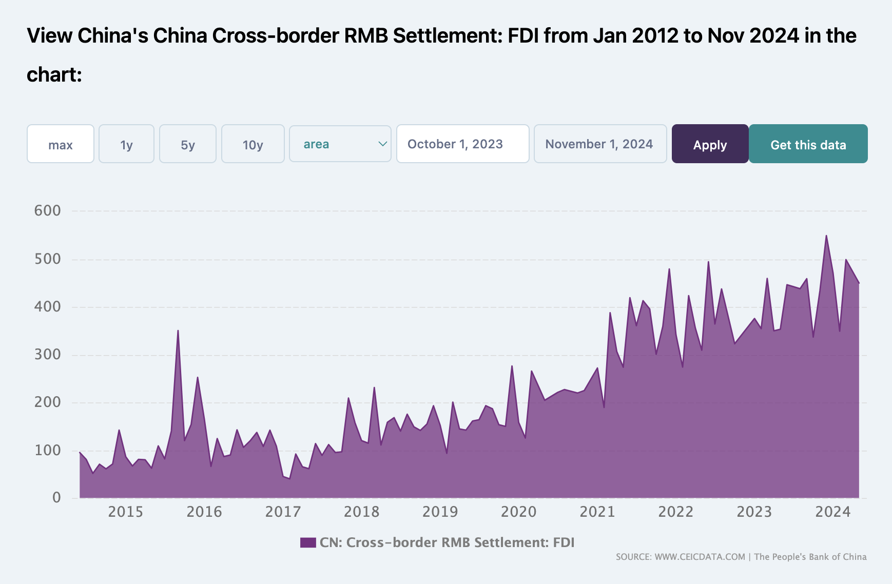從上圖可以看出,從2015年到2024年,跨境人民幣外商直接投資(FDI)結算量擴大為原來的近五倍,這表明人民幣在國際結算中的使用更加廣泛。